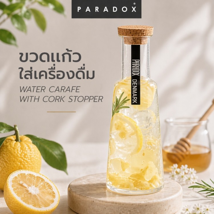 ขวดแก้วดีไซน์มินิมอลจาก PARADOX มาพร้อมฝาจุกคอร์กแน่นสนิท ใช้สำหรับใส่น้ำดื่ม เครื่องดื่มเย็น น้ำผลไม้ หรือเสิร์ฟบนโต๊ะอาหารให้ดูสวยหรูขึ้นทันที เหมาะกับบ้าน ร้านอาหาร คาเฟ่ และงานจัดเลี้ยง